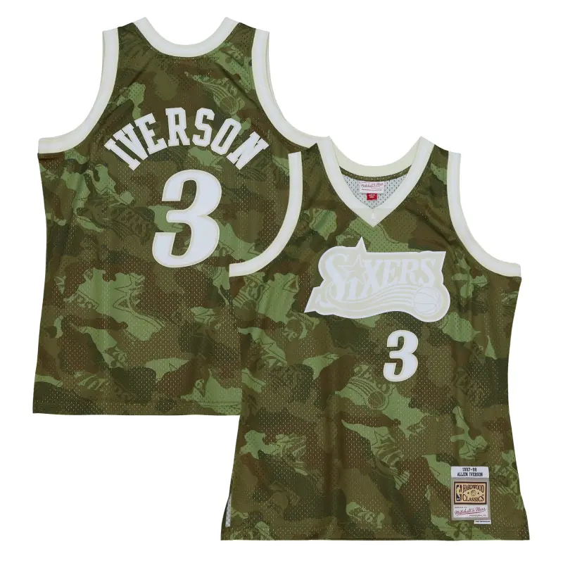 Men’s Philadelphia 76ers Allen Iverson Mitchell & Ness Camo Hardwood Classics 1997/98 Ghost Green Swingman Jersey