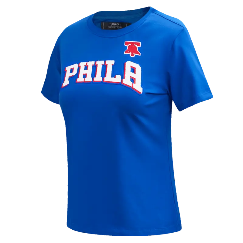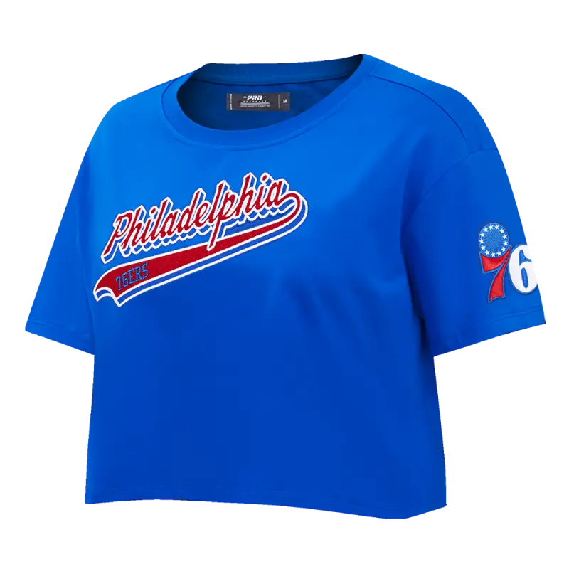 NBA PHILADELPHIA 76ers SCRIPT TAIL WOMEN’S SINGLE JERSEY BOXY TEE (ROYAL BLUE)
